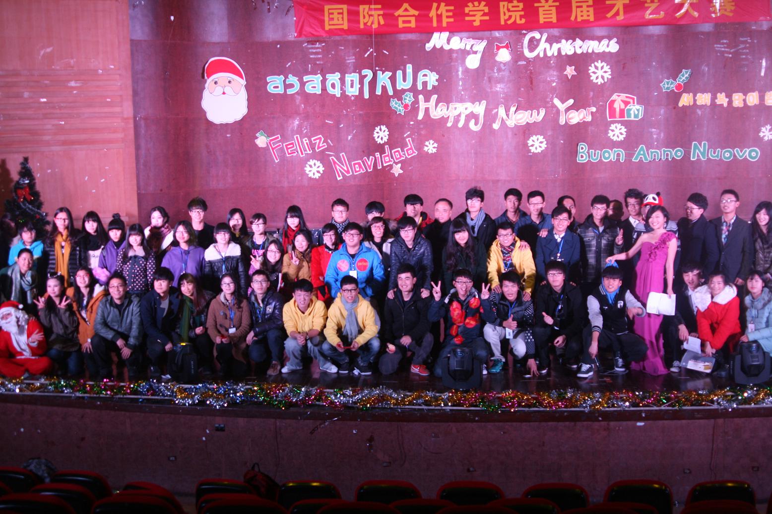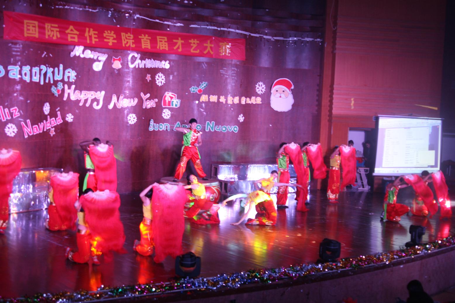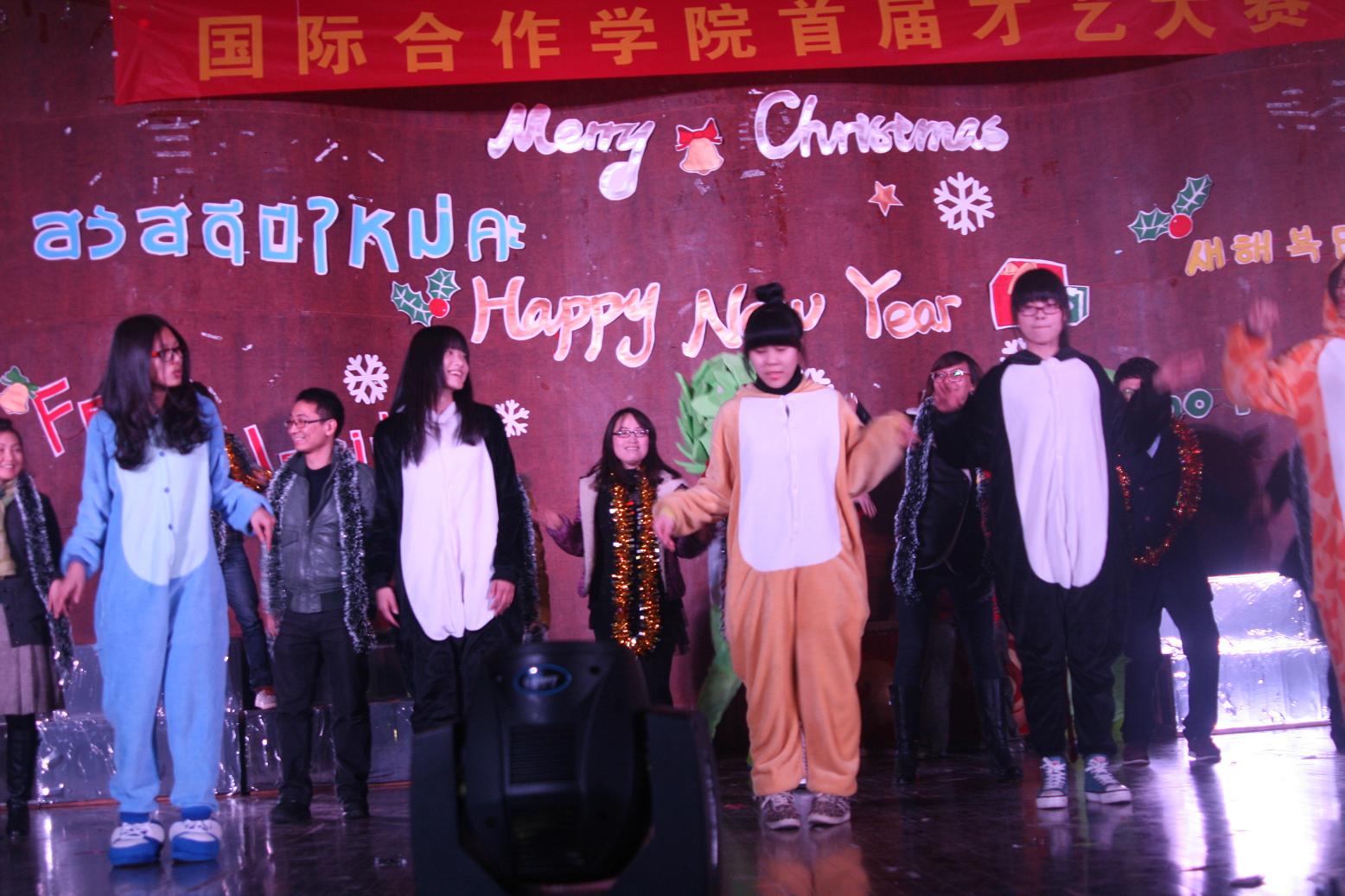 晚会在det365官网留学生表演的中国味十足的开场舞《龙腾虎跃》中拉开了序幕,由13级中丹1班同学选送的情景剧《在茶山约会吧》改编自时下流行的相亲节目,他们惟妙惟肖的演绎,令全场观众笑声不断;13级中丹2班的合唱曲目《二班去哪儿》 则是改编自当下最流行的亲子节目《爸爸去哪儿》,让现场气氛显得格外融洽;多国文化小展《欢乐的旅行》和舞蹈《tik tok kesha》看得大家如痴如醉;相声表演《李领导》不仅地道,更是韵味十足;由老师和学生联袂出演的舞台走秀《圣诞show》把才艺大赛推向了高潮。晚会节目精彩纷呈,创意无限,中西结合,颇具国际范。