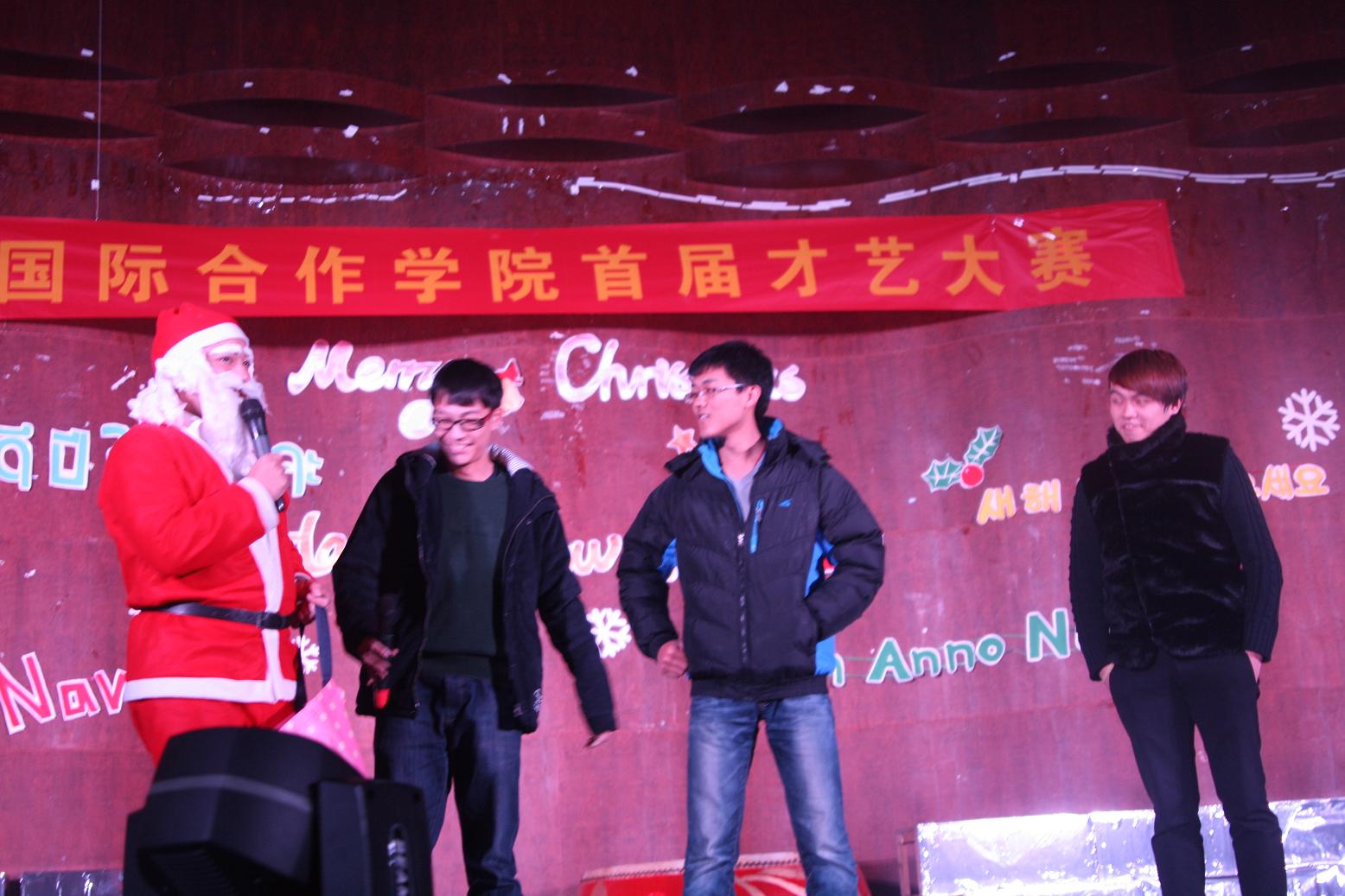 除了表演,晚会现场更是惊喜不断,不仅有圣诞老人给在场师生派发礼物,更有温大校庆吉祥物“文文”和“达达”亲临现场为观众带来精美礼品。最激动人心的应该是利用微博大屏幕互动,进行抽奖环节。但是领奖可并不轻松,荷兰学生扮演的圣诞老人设置了重重关卡,只有全程流利地答对英文问题,才能顺利领奖。让在场的师生观众直呼太难,求领奖不回答英文问题。