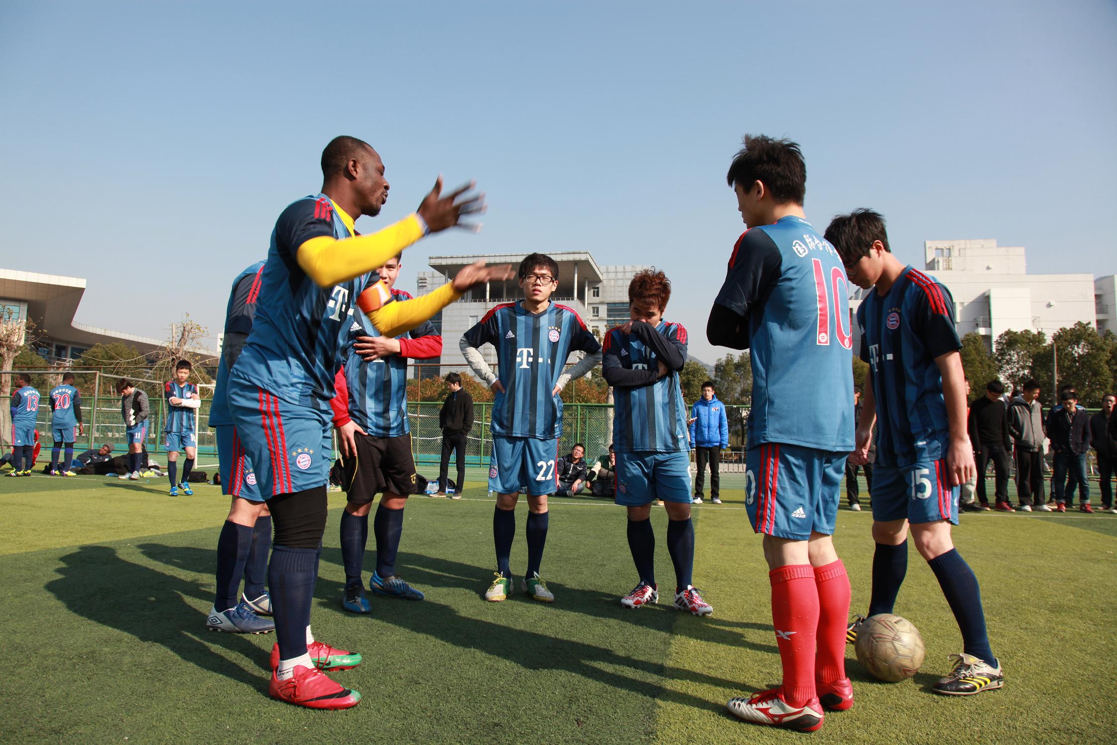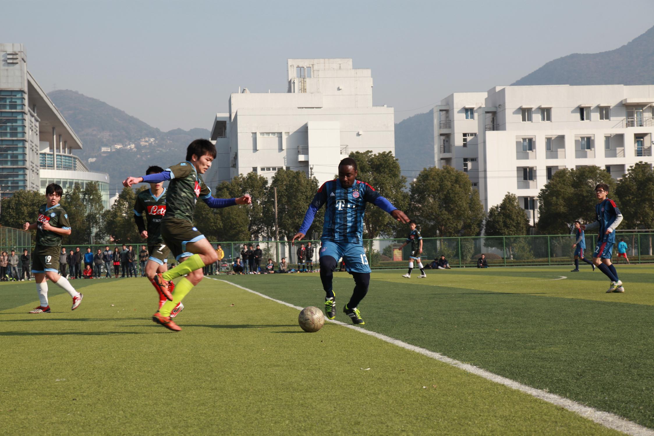 det365官网网站2013年“金秋杯”足球赛决赛于12月末在北校区足球场举行。比赛在国际合作学院与瓯江学院之间展开,两院队伍都是经过激烈角逐挺进决赛。国际合作学院的“联合国足球队”由中国、泰国、尼日利亚、加纳等国家学生组成,赛场旁围满了前来观战的球迷,全场热情高涨。