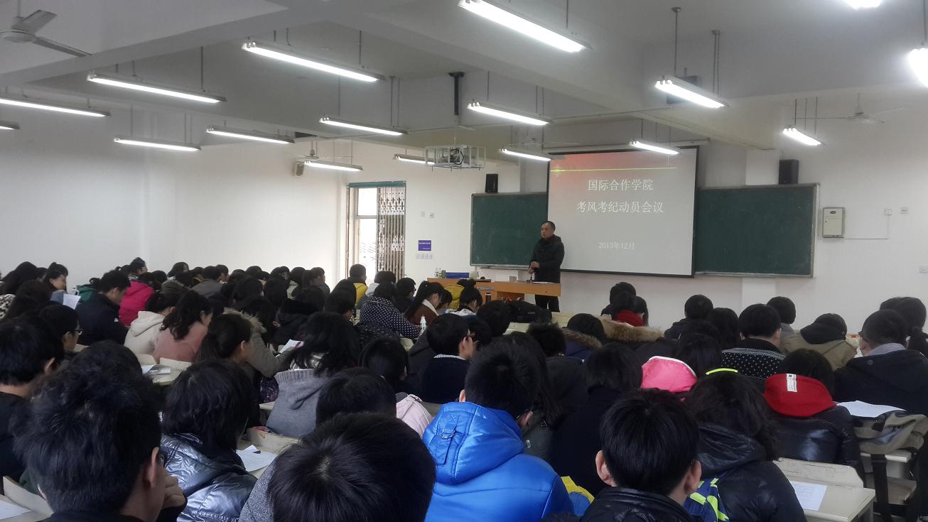 会议开始前,每位同学都收到了一份《国际合作学院学生诚信考试承诺书》,陈赞安老师就承诺书上的条款向同学们进行了解释。接着,他就det365官网本学期的学风情况进行了通报,指出虽然det365官网学风情况良好,但仍然有少部分同学存在迟到、上课玩手机的不良习惯。他重申了《国际合作学院关于请假手续、考勤制度的实施办法》,要求纪律委员和学生会加强办法的执行力度,并对本学期违反相关规定的同学进行了严肃批评。朱建平书记结合《学生手册》相关规定,引用了数个考场违纪案例,向同学们强调三点:一是从思想上充分重视期末考试,合理安排复习时间,提高学习效率;二是诚信应考,严格遵守考场纪律,杜绝一切作弊行为以及帮助别人作弊的行为,做到期末考试零违纪;三是在复习期间要注意劳逸结合,保证身体健康,在期末考试中发挥正常水平。此外,他还就假期返乡向同学们强调了人财物的安全事宜。
