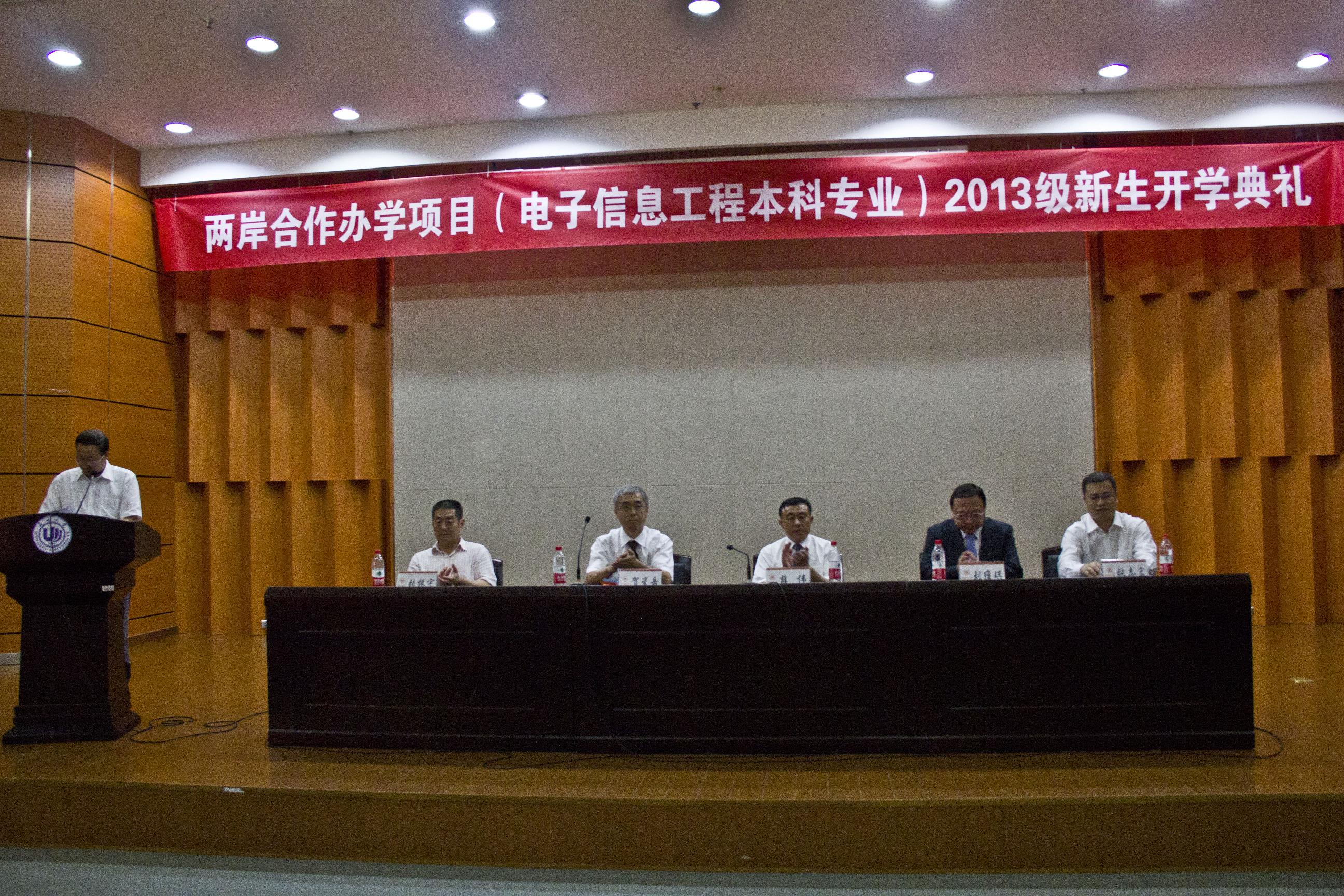 9月13日上午,我校在南校区岩松堂隆重举行两岸合作办学项目(电子信息工程专业本科教育项目)2013级新生开学典礼,台湾中华大学校长刘维琪,我校副校长薛伟、浙江工贸职业技术学院院长贺星岳,温州市教育局副书记、副局长张志宏,温州市台办副主任张振宇以及三校的有关学院、部门领导和老师出席典礼。开学典礼由det365官网网站国际合作学院院长严晓鹏主持。