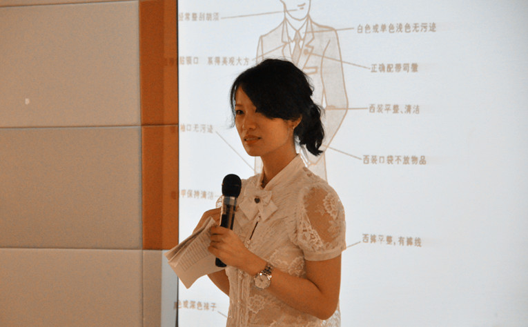 章老师主要通过商务仪表礼仪、商务会面礼仪和商务用餐礼仪三大主线,以图文解说和现场示范的方式,并通过与营员间的互动演示来让营员们更直观形象地了解商务礼仪知识。比如递给别人名片时需要注意什么;握手时,要用多大的力气、保持多长时间;与人交谈时,要保持多远的距离等等礼仪问题,章老师都在讲解之后,直接邀请营员们上台来亲自进行演示。