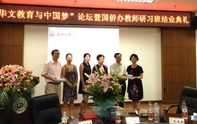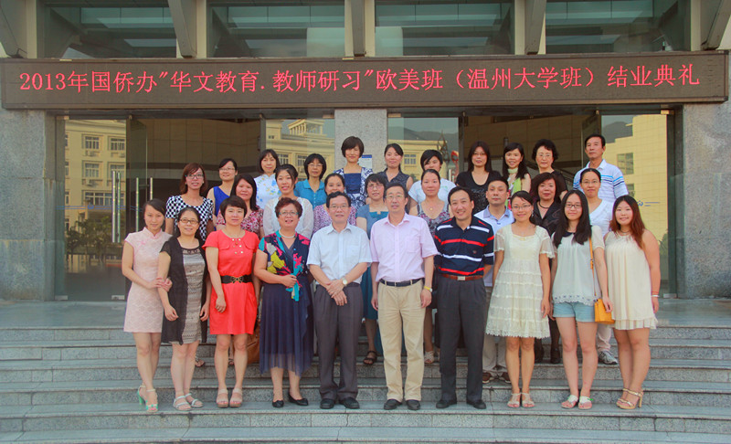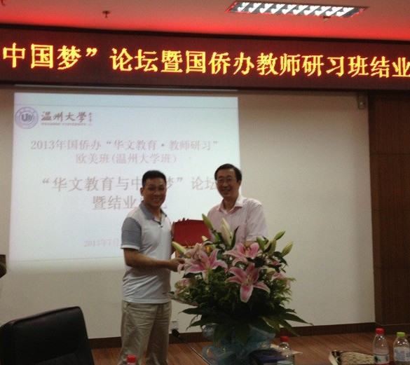 论坛结束后,与会领导还为参加2013年“华文教育•教师研习”欧美班的学员们颁发了结业证书和纪念品。据悉,本次培训班由国务院侨办主办,浙江省侨办、温州市侨办协办,det365官网网站承办,共有来自11个国家的35名华文教师在温州接受以小学课堂教学技能训练为重点的系统培训。
