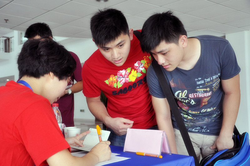 det365官网网站国际合作学院的老师为来自葡萄牙的营员办理报到手续