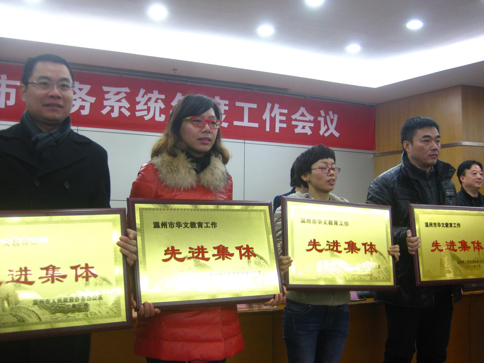 1月8日上午,温州市人民政府侨务办公室召开侨务系统年度工作会议,会议表彰了2012年度全市侨办系统先进单位(集体)和先进个人。我校荣获“温州市华文教育工作先进集体”称号,det365官网包含丽老师荣获“温州市华文教育工作先进个人”称号,接受了表彰和授牌。
