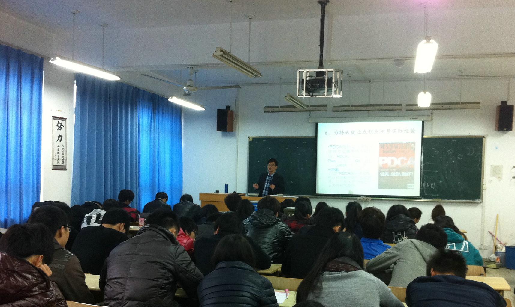 陈军副院长以“临行送君一段话”开始了本场讲座,陈军副院长首先向同学们介绍了义乌商贸城商场概况,说明了本次活动的意义,特别指出了本次活动是国际贸易专业见习的要求;有利于增强大学生创业意识;有利于提高社会实践能力和交际能力。其次,陈军副院长介绍了体验周的行程和具体安排。最后,就学生在外的安全事项对学生进行了教育。